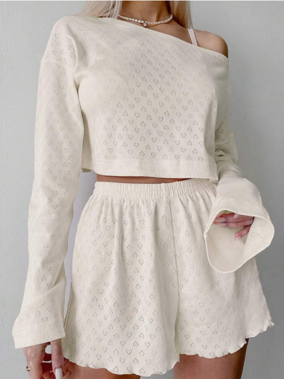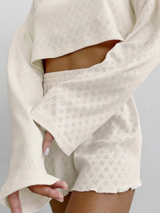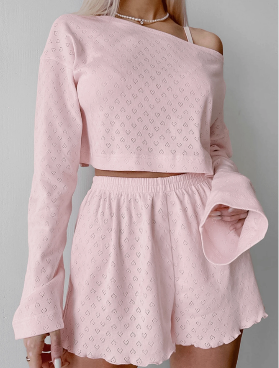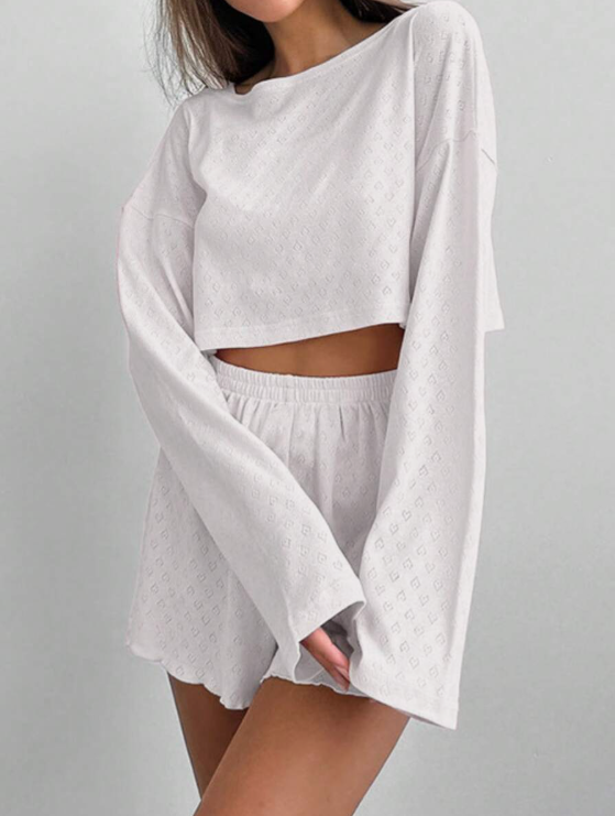 סט פיג'מה רך וגמיש בתערובת סריג עם שרוולים ארוכים וחולצה קצרה לנשים, חופשה ותלבושות