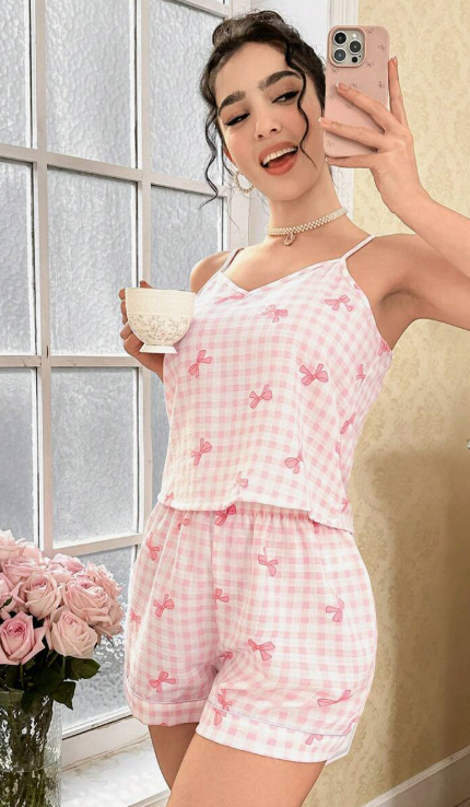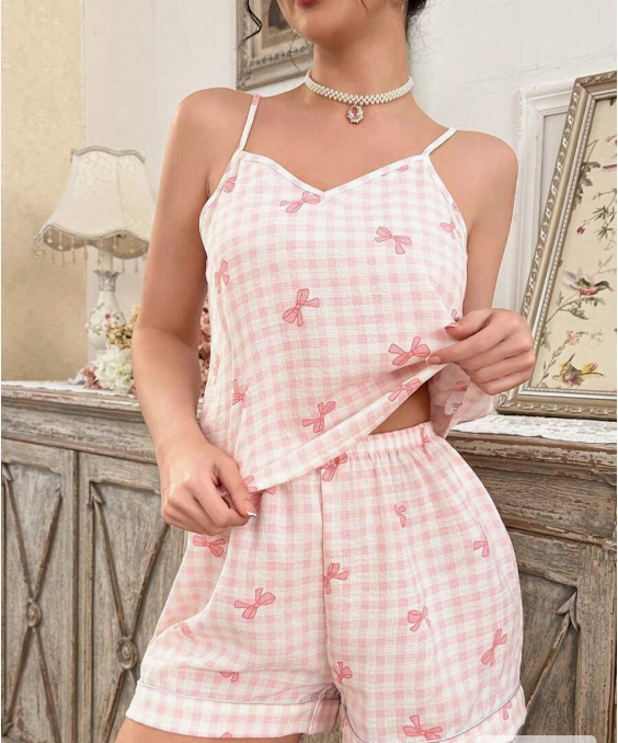 סט פיג'מות עם הדפס פפיון משובץ של CottageSlumber, 2 יחידות/סט, חולצה ומכנסיים קצרים בסגנון נערה צעירה וחמודה, פאר פרחוני שופע