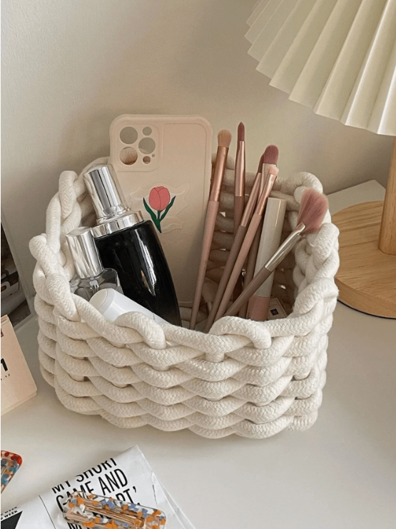 קופסת אחסון איפור לבנה ארוגה ביד מחבל עבה, לארגון מברשות קוסמטיקה ומוצרי טיפוח לעור,