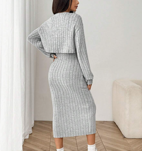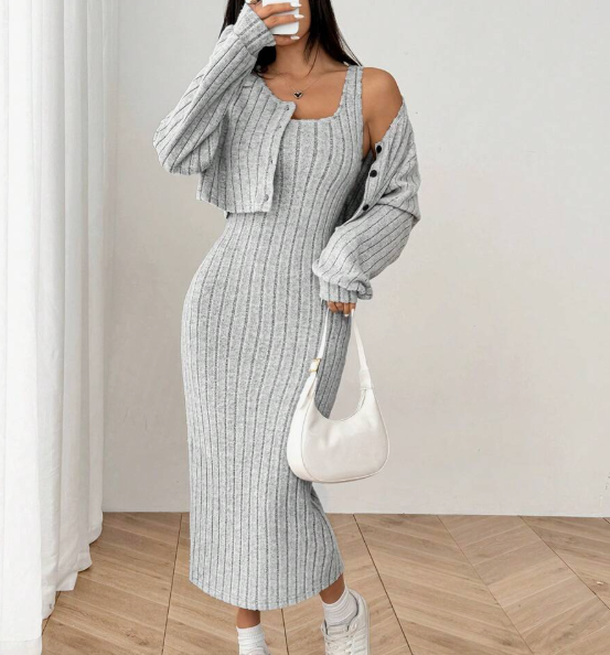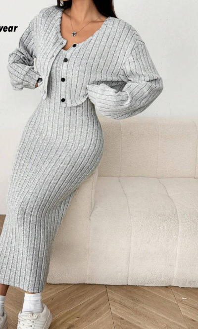 קרדיגן מצולע חדש לנשים לסתיו/חורף עם כפתורים ושמלת מידי צמודה