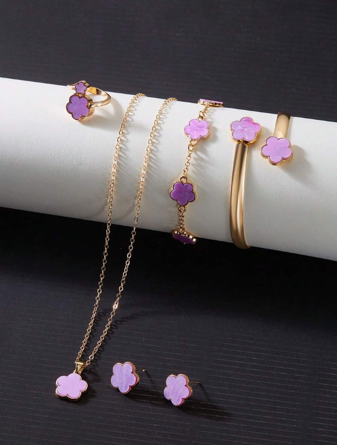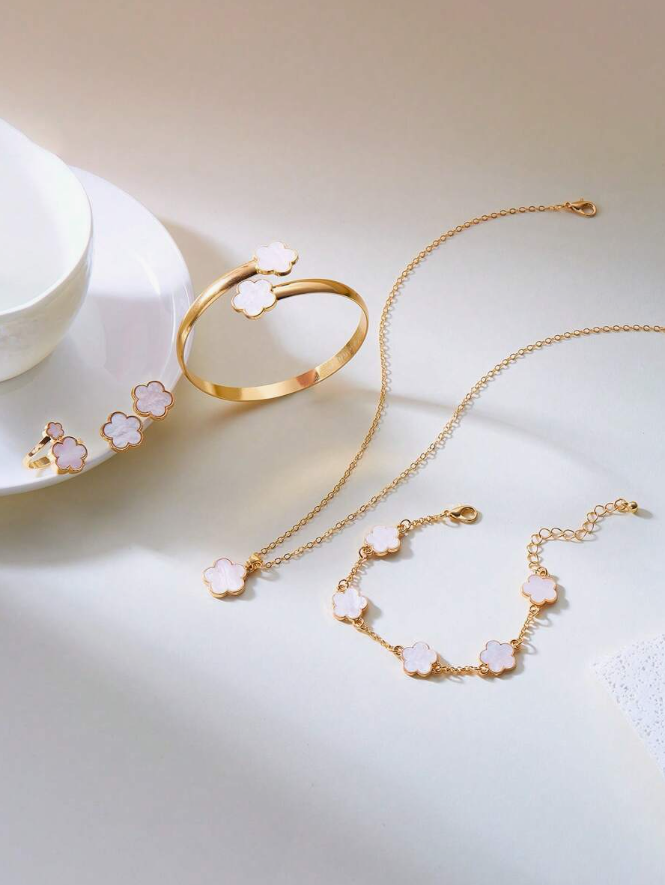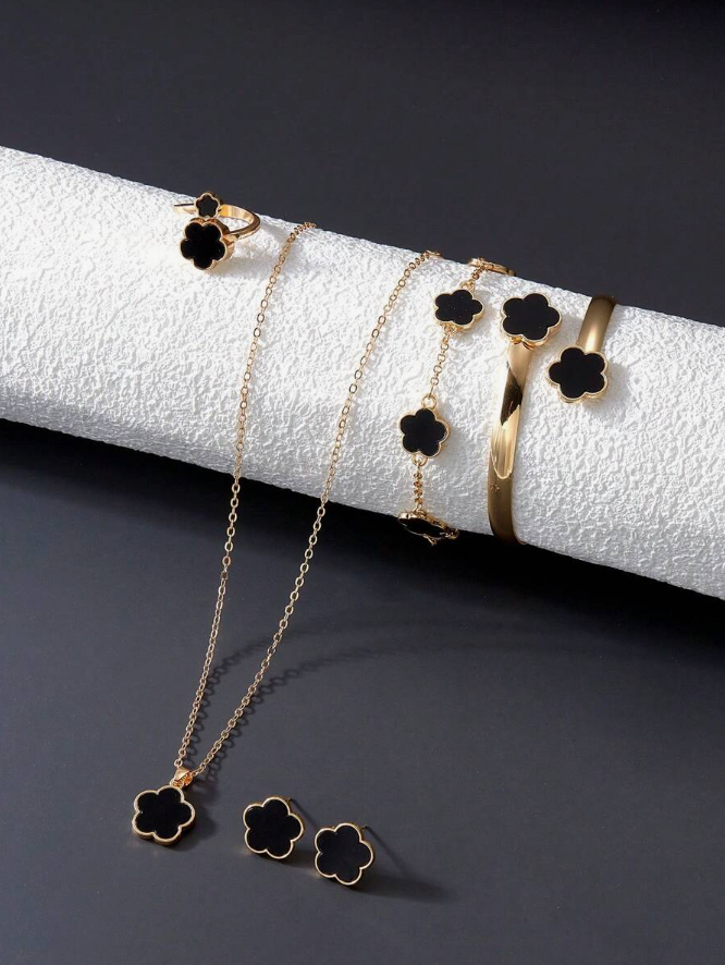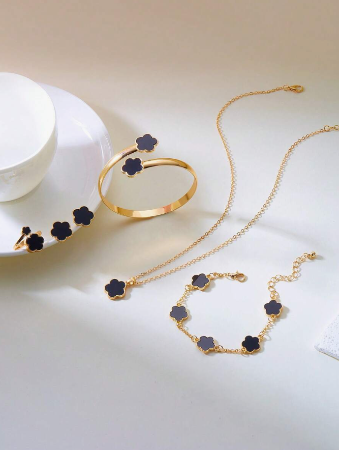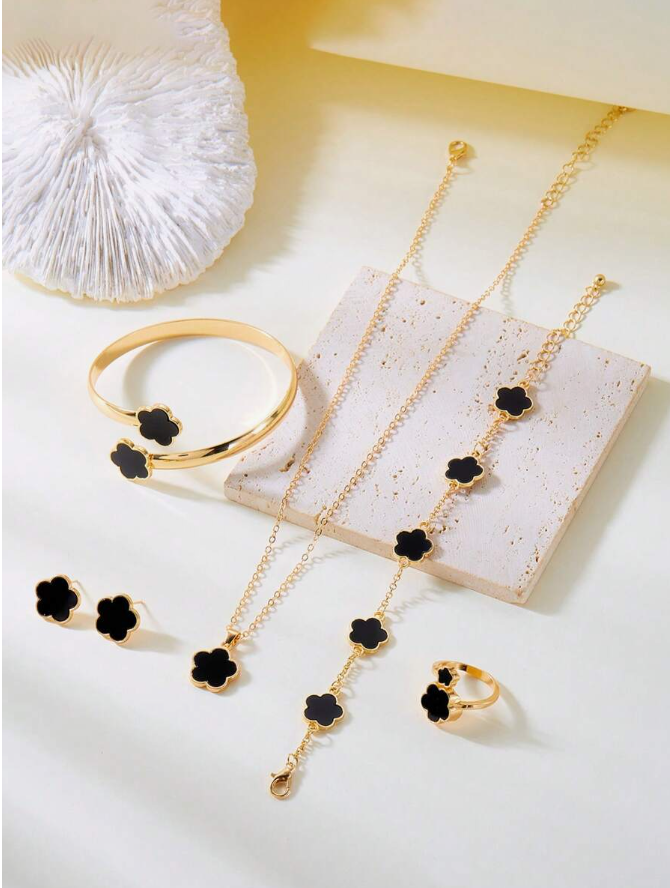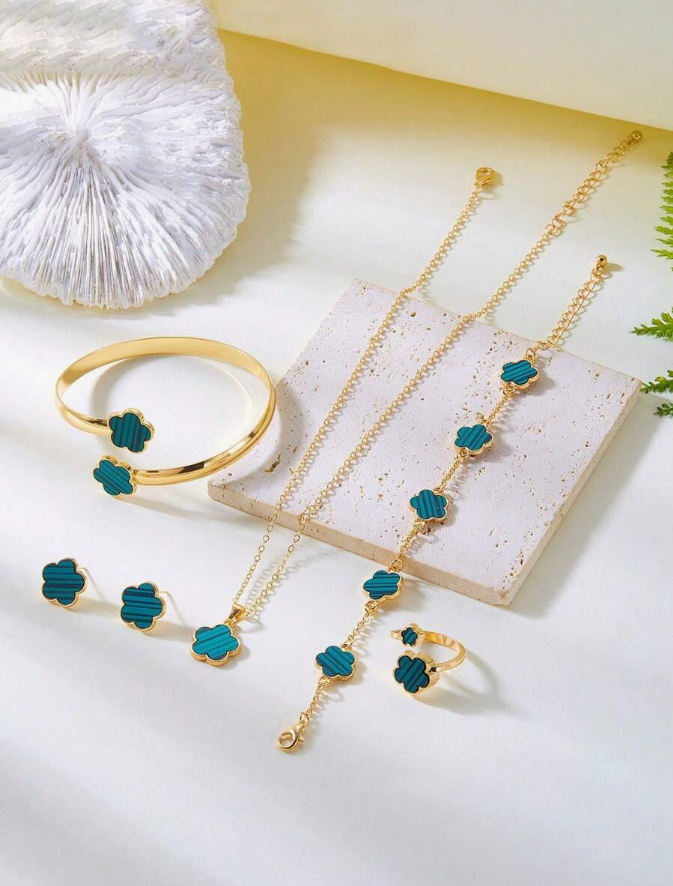 סט תכשיטים של 6 יחידות בסגנון תלתן, שרשרת תליון, צמיד, טבעת ועגילים.